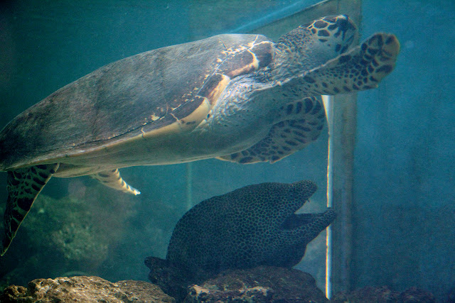 Pojechaliśmy dziś obejrzeć akwarium na Mauritiusie – zupełnie niepozorne miejsce, gdzie w akwariach pływa i pełza wszystko, co żyje w oceanie indyjskim. Na chłopakach największe wrażenie robiły chyba żółwie morskie (a wiecie, że żółwie morskie mają pazur?), mureny i rekiny, obiecaliśmy wrócić tam jeszcze w porze karmienia.